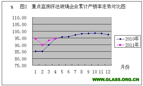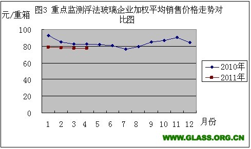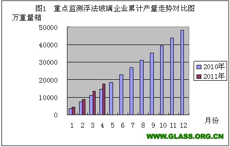 依據(jù)中國建筑玻璃與工業(yè)玻璃協(xié)會對全國重點(diǎn)監(jiān)測浮法玻璃企業(yè)月快報數(shù)據(jù)綜合統(tǒng)計顯示:本月產(chǎn)量、銷售量與去年同期相比有所增加;1-4月份累計產(chǎn)量同比增加21.66%;累計銷售量同比增加22.08%;期末庫存量同比增加566萬重箱,環(huán)比增加31萬重量箱;本月產(chǎn)品價格每重量箱同比下降4.95元,環(huán)比下降0.16元。