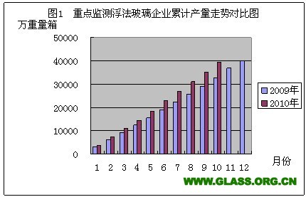 一是生產(chǎn)快速增長(zhǎng)。協(xié)會(huì)重點(diǎn)監(jiān)測(cè)浮法玻璃企業(yè),今年1—10月份累計(jì)生產(chǎn)浮法玻璃3.94億重量箱,同比增長(zhǎng)21.23%,與2009年比較其產(chǎn)量走勢(shì)變化見圖一。