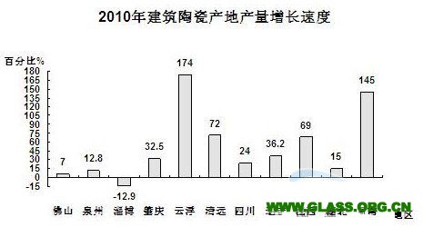 我國的陶瓷行業(yè)在“十一五”期間不斷推陳出新,產(chǎn)量也大幅度提高。2005年建筑陶瓷產(chǎn)量為35億平方米,衛(wèi)生陶瓷產(chǎn)量8000億件,五年后的2010年,建筑陶瓷產(chǎn)量為78.09億平方米,同比增長19.6%,銷售收入預計為2500億元,同比增長30%,利潤將達150億元,同比增長31.5%。衛(wèi)生陶瓷產(chǎn)量為1.74億件,銷售收入預計330億元,利潤將達27.5億元。“十一五”期間,建筑陶瓷產(chǎn)量增長了125.4%,衛(wèi)生陶瓷產(chǎn)量增長了117.5%。從2010年看,陶瓷產(chǎn)量最大省仍在廣東,其次是福建,以建筑陶瓷為例,廣東已占全國總量的四分之一(見圖6),產(chǎn)量達到近20億平方米。