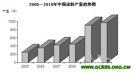 2010年我國涂料產(chǎn)量為966.6萬噸,同比上升22.8%,其中建筑涂料為351.9萬噸,同比上升23.7%,繼2009年后又迎來了一個較大的發(fā)展(見圖7)。