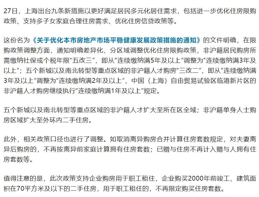 上海出臺“滬九條”,優(yōu)化調整房地產市場政策
