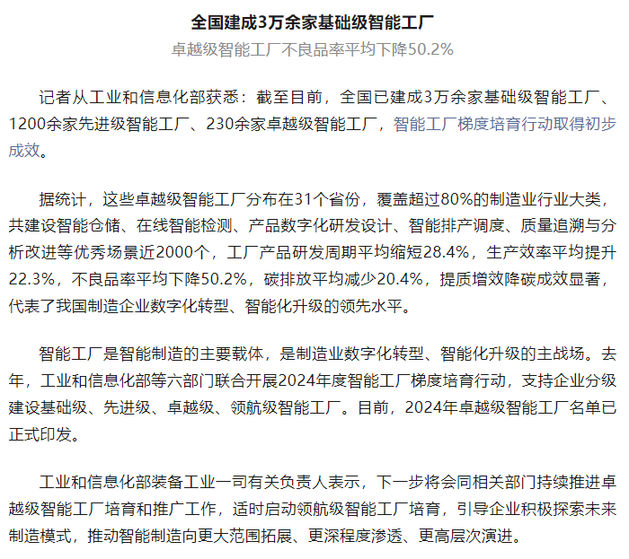 全國(guó)建成3萬(wàn)余家基礎(chǔ)級(jí)智能工廠