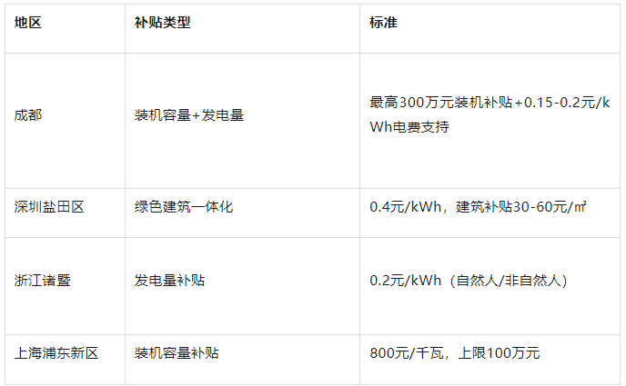北京市:對500kW以上法人項目要求接入監(jiān)測平臺,按發(fā)電量給予補(bǔ)貼;新建綠色建筑項目按星級給予30-60元/平方米補(bǔ)貼。