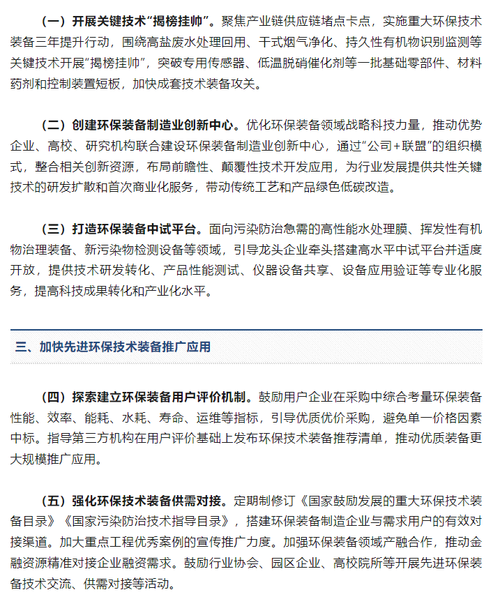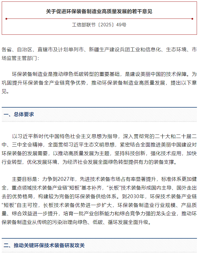 工業(yè)和信息化部、生態(tài)環(huán)境部、市場監(jiān)管總局近日聯(lián)合印發(fā)《促進(jìn)環(huán)保裝備制造業(yè)高質(zhì)量發(fā)展的若干意見》(工信部聯(lián)節(jié)〔2025〕49號(hào),以下簡稱《意見》),著力推動(dòng)環(huán)保裝備制造業(yè)持續(xù)健康穩(wěn)定發(fā)展,打造具有國際競爭優(yōu)勢的萬億級(jí)產(chǎn)業(yè)?!兑庖姟诽岢龅?027年,先進(jìn)技術(shù)裝備市場占有率顯著提升,重點(diǎn)領(lǐng)域技術(shù)裝備產(chǎn)業(yè)鏈“短板”基本補(bǔ)齊,“長板”技術(shù)裝備形成國內(nèi)主導(dǎo)、國外走出去的優(yōu)勢格局。到2030年,環(huán)保技術(shù)裝備產(chǎn)業(yè)鏈“短板”自主可控,長板技術(shù)裝備優(yōu)勢進(jìn)一步擴(kuò)大,環(huán)保裝備制造業(yè)從傳統(tǒng)的污染治理向綠色、低碳、循環(huán)發(fā)展全面升級(jí)。《意見》從強(qiáng)化關(guān)鍵技術(shù)攻關(guān)、加快先進(jìn)技術(shù)推廣、培育行業(yè)發(fā)展新動(dòng)能、優(yōu)化產(chǎn)業(yè)發(fā)展環(huán)境4個(gè)方面提出12項(xiàng)政策措施。其中,強(qiáng)化關(guān)鍵技術(shù)攻關(guān)將聚焦產(chǎn)業(yè)鏈供應(yīng)鏈堵點(diǎn)卡點(diǎn),開展關(guān)鍵技術(shù)“揭榜掛帥”,實(shí)施重大環(huán)保技術(shù)裝備三年提升行動(dòng),深入推進(jìn)5G、人工智能等新一代信息技術(shù)在環(huán)保裝備設(shè)計(jì)制造、污染治理和環(huán)境監(jiān)測等領(lǐng)域的應(yīng)用。優(yōu)化產(chǎn)業(yè)發(fā)展環(huán)境將引導(dǎo)環(huán)保裝備企業(yè)在各自細(xì)分領(lǐng)域精耕細(xì)作,打造一批行業(yè)規(guī)范條件企業(yè)、專精特新“小巨人”企業(yè)和制造業(yè)單項(xiàng)冠軍企業(yè)。推動(dòng)龍頭企業(yè)從提供單一領(lǐng)域環(huán)保技術(shù)裝備,向多領(lǐng)域“產(chǎn)品+服務(wù)”供給轉(zhuǎn)變,加強(qiáng)行業(yè)規(guī)范引導(dǎo),推動(dòng)建立公平競爭、健康有序的市場發(fā)展環(huán)境。加快發(fā)展環(huán)保裝備制造業(yè)既是推動(dòng)傳統(tǒng)制造業(yè)綠色轉(zhuǎn)型升級(jí)的重要保障,也是培育壯大戰(zhàn)略性新興產(chǎn)業(yè)的迫切需要。歷經(jīng)數(shù)十年的發(fā)展,我國環(huán)保裝備制造業(yè)產(chǎn)業(yè)規(guī)模持續(xù)壯大,據(jù)有關(guān)行業(yè)協(xié)會(huì)測算,“十三五”以來,環(huán)保裝備制造業(yè)總產(chǎn)值年復(fù)合增長率接近6%,2024年達(dá)到9200億元。環(huán)保技術(shù)發(fā)展呈現(xiàn)出“總體并跑、局部領(lǐng)跑”特征,整機(jī)和成套裝備基本滿足國內(nèi)污染治理需求。