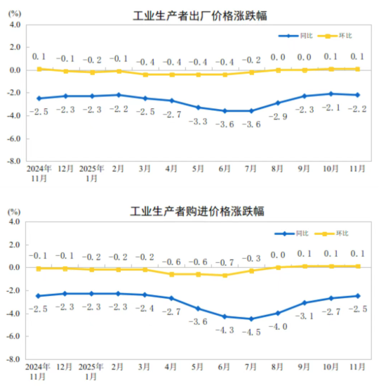 2025年11月份,全國(guó)工業(yè)生產(chǎn)者出廠價(jià)格同比下降2.2%,工業(yè)生產(chǎn)者購(gòu)進(jìn)價(jià)格同比下降2.5%;工業(yè)生產(chǎn)者出廠價(jià)格和購(gòu)進(jìn)價(jià)格環(huán)比均上漲0.1%,漲幅均與上月相同。1—11月平均,工業(yè)生產(chǎn)者出廠價(jià)格比上年同期下降2.7%,工業(yè)生產(chǎn)者購(gòu)進(jìn)價(jià)格下降3.1%。
