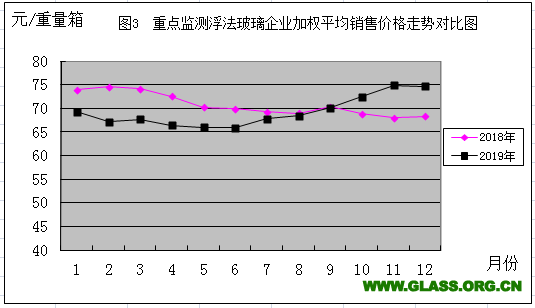 2018年與2019年重點(diǎn)監(jiān)測浮法玻璃加權(quán)平均銷售價(jià)格走勢對比圖
