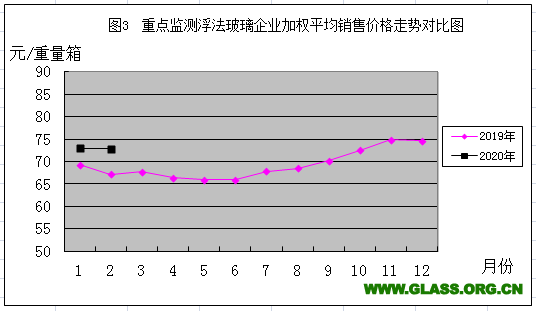 2019年與2020年重點監(jiān)測浮法玻璃加權平均銷售價格走勢對比圖