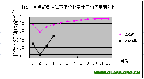 2019年與2020年重點(diǎn)監(jiān)測(cè)浮法玻璃企業(yè)累計(jì)銷售率走勢(shì)對(duì)比圖(2020年4月份)
