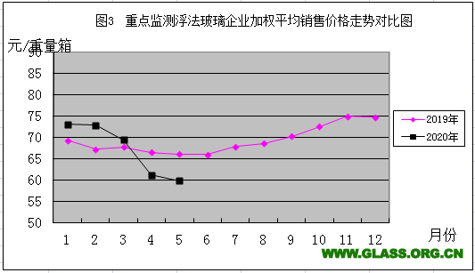 2019年與2020年重點(diǎn)監(jiān)測(cè)浮法玻璃加權(quán)平均銷售價(jià)格走勢(shì)對(duì)比圖