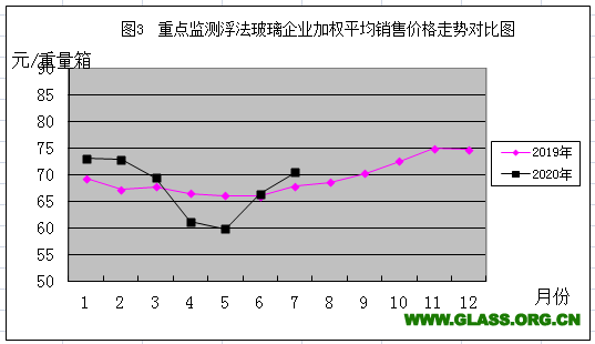 2019年與2020年重點監(jiān)測浮法玻璃加權(quán)平均銷售價格走勢對比圖