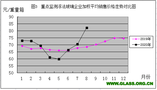 2019年與2020年重點(diǎn)監(jiān)測浮法玻璃加權(quán)平均銷售價(jià)格走勢對比圖