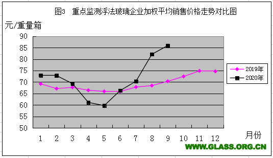 2019年與2020年重點(diǎn)監(jiān)測(cè)浮法玻璃加權(quán)平均銷售價(jià)格走勢(shì)對(duì)比圖