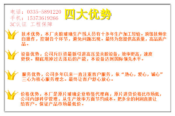 www.boligongchang.com我公司位于河北省秦皇島,是當(dāng)?shù)匾?guī)模和管理比較出名的一家玻璃深加工企業(yè),產(chǎn)品覆蓋東北西北市場。東北每天都有發(fā)貨。盤錦錦州幾乎3-7天都有發(fā)貨。有明顯價格和質(zhì)量優(yōu)勢。